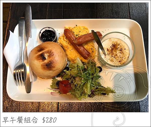 上菜時對擺盤感到驚艷,豐富滿滿的一個木頭沾板,有著各種不同的容器及餐點,果汁用的是可愛的小高腳杯裝盛,優格則放在百香果裡,各式沾醬則用不同顏色的小容器搭配,視覺豐富感立即提升。食物部分沙拉品質不錯,紅蘿蔔削成寬條狀很少見,可以充分嚐到清脆的口感;優格口味自然,搭配一點百香果果肉,創意與美味兼具;翼板牛排撒上香料及一點迷迭香及切碎的羅勒(應該是),調味豐富,但牛排部分稍微過熟了,肉味偏淡,肉質鬆散。吐司鑲太陽蛋上面放上了一塊萬惡奶油,簡單的胡椒鹽調味,太陽蛋料理得很好,但麵包讓人失望,有種久放的味道跟口感,既不鬆軟也無香味(難不成是昨天剩下的麵包屁股嗎?);白色小盤裝的是辣椒鹽,搭配炸薯塊很對味,薯塊炸得非常好,外表酥脆,內部鬆軟;果醬沒記錯的應該是鳳梨果醬,可以搭配優格或是沙拉吃;果汁則是蘋果薄荷水,因為果汁雖是新鮮但比重很少,應是稱作水果水。